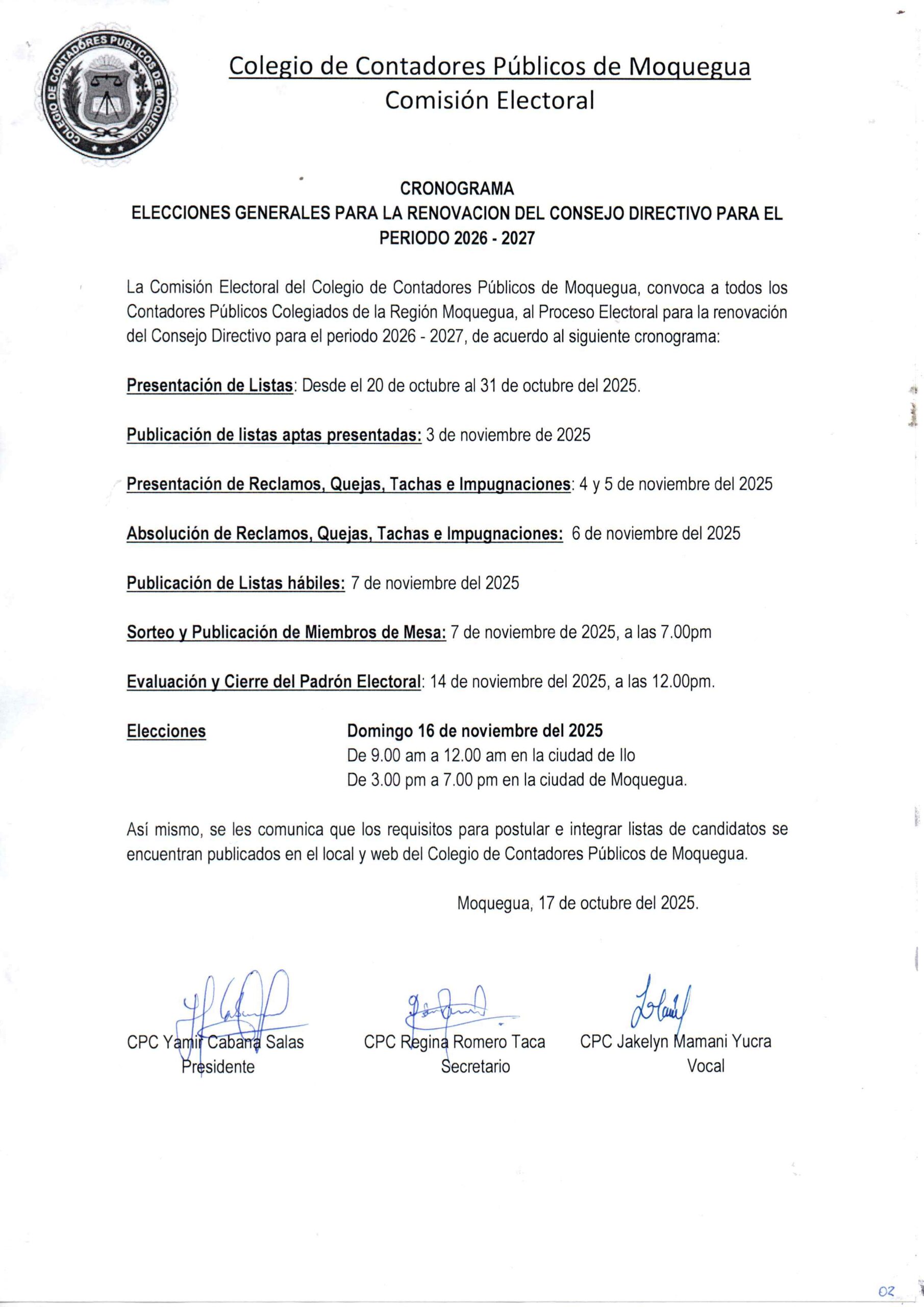 La ComisiΓ³n Electoral del Colegio de Contadores PΓΊblicos de Moquegua informa a todos los miembros hΓ‘biles que se ha aprobado el cronograma oficial de elecciones generales para la renovaciΓ³n del Consejo Directivo correspondiente al periodo 2026β2027.